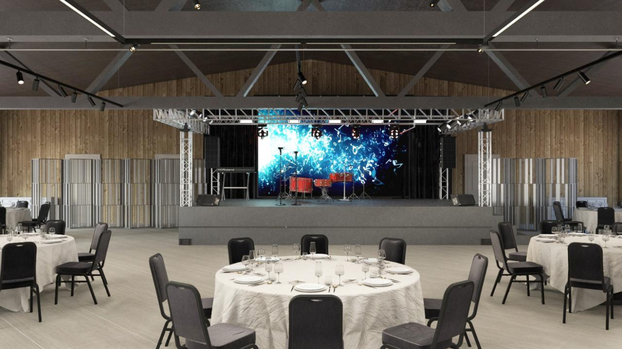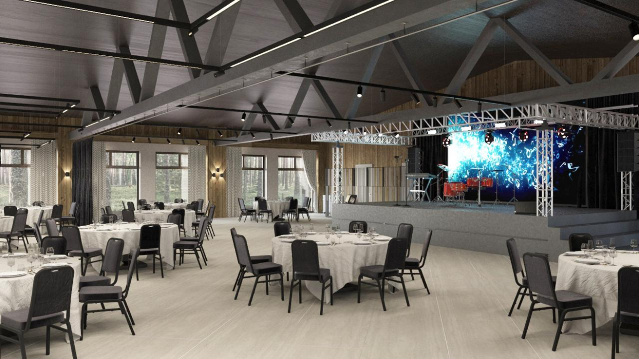 Банкет на 250 гостей: площадка для торжественных мероприятий и корпоративов с большой профессиональной сценой и звуковым оборудованием под запрос.