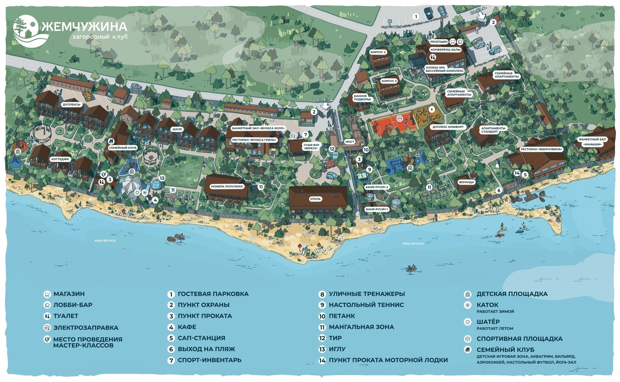 - Семейный загородный клуб «Жемчужина» расположен на левом берегу реки Вуокса, рядом с Лосевскими порогами, всего в 45 минутах от Санкт-Петербурга.
